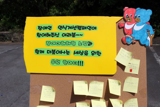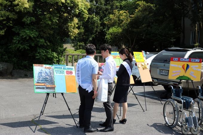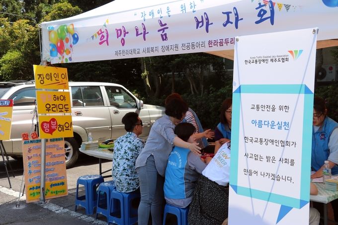 한국교통장애인협회와 제주한라대학교 장애학생지원센터가 공동 주최하고 제주한라대 사회복지학부 장애인 전공동아리 '한라곰두리'가 주관하는 2017 교통안전·장애인식 개선 캠페인이 제주한라대학교에서 이틀째 진행되고 있다.