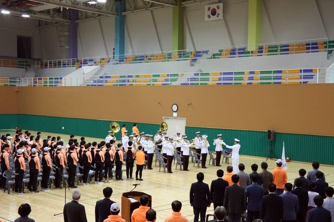 ▲ 참가자들이 군악대 반주에 맞춰 애국가를 제창하고 있다