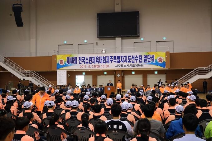 오는 27일부터 30일까지 충청남도 일대에서 개최되는 제46회 전국소년체육대회에 출전하는 제주도 선수단이 22일 오후 제주복합체육관에서 결단식을 가졌다.