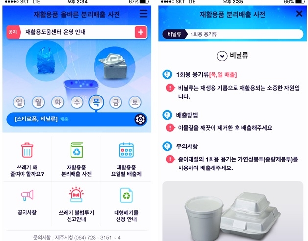 설치방법은 구글 플레이스토어 또는 앱 스토어에서 ‘제주시 재활용품 분리배출 사전’검색하면 된다.