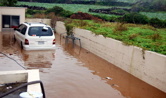 지난 2일 표선과 성산 등 동부 중간간지역에 2시간 동안 난산리 244mm, 온평리 164mm 등의 강수량을 기록한 기습폭우로 도로, 농경지 등 침수피해가 발생한 바 있다.
