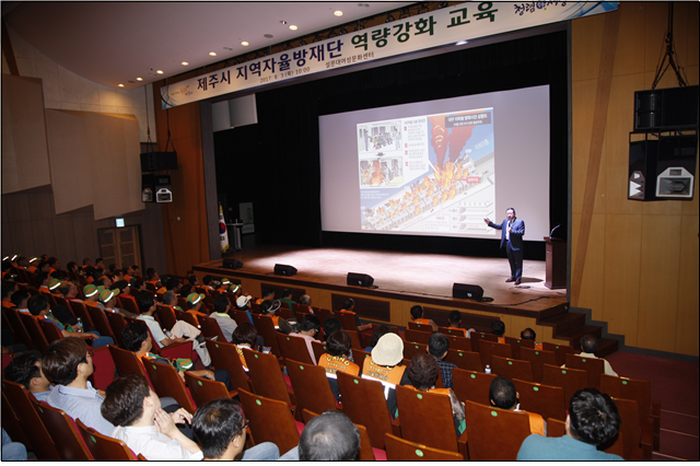 제주시 지역자율방재단원과 재난업무담당 공무원 300여명을 대상으로 실시된 교육은 지난해 폭설과 태풍 차바 내습 시 복구활동에 헌신적으로 참여한 유공 단원에 대한 제주시장 표창 수여에 이어 한국안전교육센터 김랑일 박사의 특강이 이어졌다.