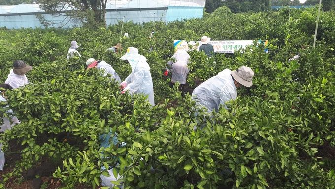 이에 서귀포농업기술센터는 8월 9일 남원리 고경희 과원에서 생활개선회원 50명이 참석한 가운데 열매솎기 연시교육 및 봉사활동을 시작으로 참여 확산에 나선다.
