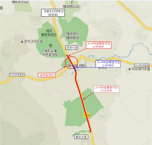 주요 개선내용을 살펴보면 교래사거리 교차로에 대한 전면확장을 비롯, 우회전 및 좌회전 차로를 신설하고 최신 감응식 신호체계를 도입하는 한편 붉은오름부터 갓전시장 입구까지 3.3km 구간에 대한 확장공사가 진행된다.