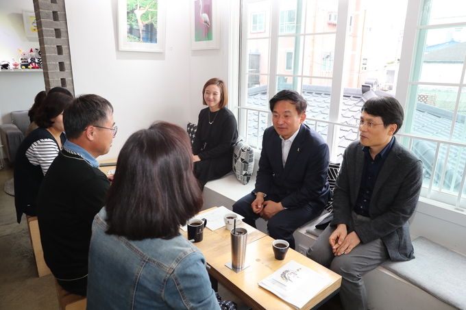 17일 오후 제주 제주시 서광로 한 카페에서 세월호 피해자 가족들, 상담소 관계자들과 만난 원희룡 지사는 “올해에는 세월호 피해자들의 전문 치료를 위한 상담소 리모델링 비용을 지원했지만 심리안정과 사회적응을 위한 보다 더 다양한 상담 프로그램 등을 통해 생존자들의 어려움들을 보듬도록 하겠다”고 전했다.