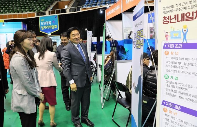 원 지사는 행사장을 돌며 박람회에 참여한 업체들의 기업정보, 구인 상황, 근로조건 등 현황들을 살펴보고, 실제 면접이 진행되고 있는 과정을 지켜봤다.