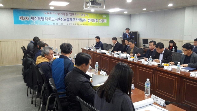 이번 정책협의는 민주노총제주지역본부가 「노동자가 살기좋은 행복도시 만들기」를 위한 9대 과제 45개 세부과제를 확정하고 제주도에 노정교섭을 제안한 것을 원희룡 제주도지사가 전격 수용하면서 시작됐다.