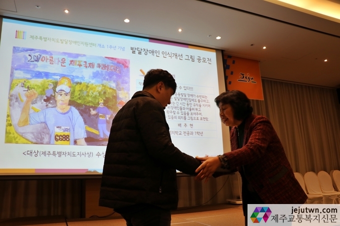 이석문 제주도교육감과 제주도의회 의원들, 그리고 도내 복지단체 관계자 및 자원봉사자, 발달장애인 가족 등이 참여한 이날 행사에서는 개소 1주년 기념식과 특강, 발달장애인 그림 공모전 시상 등이 진행됐다.