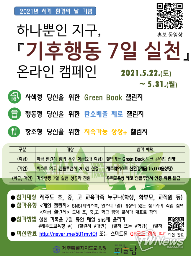 [제주교통복지신문=박희찬 기자] 제주도교육청은 6월 5일 ‘세계 환경의 날’을 맞아 도내 각급학교 학생, 학부모, 교직원을 대상으로 「기후행동 7일 실천」 온라인 챌린지와 「에코 인플루언서」 상징 이미지 공모전을 개최했다고 밝혔다.