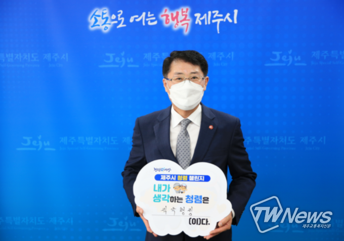[제주교통복지신문 김현석 기자] 제주시 청렴 이끄미 직원들이 추진하고 있는 청렴 문화 확산 운동의 일환인 ‘찾아가는 청렴 선언 챌린지’에서 4일 안동우 제주시장이 내가 생각하는 청렴은 ‘적극행정’이다 라고 답했다.