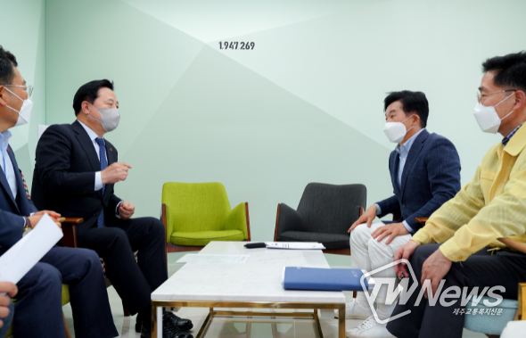 원희룡 도지사는 5일 오후 4시 30분 집무실에서 김두관 국회의원과 면담하고 제주도민 선제적 예방접종 등 코로나19 시대 안전한 제주관광 환경 조성을 위한 협력 방안에 대해 논의했다.