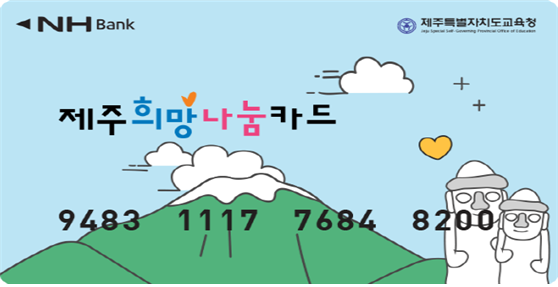‘제주희망나눔카드’란 특수교육대상자가 치료지원서비스 제공기관(가맹점)에서 치료서비스를 받고 해당 비용(월 10만원 한도)을 결제할 수 있는 제주도교육청 치료비 지원 전자카드이다.