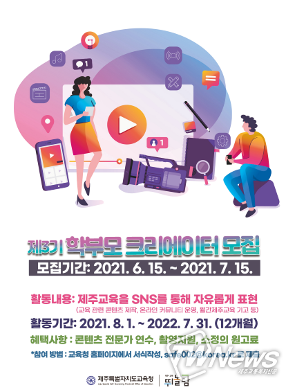 [제주교통복지신문=박희찬 기자] 제주도교육청은 학부모들이 주체적으로 참여하는 교육 소통‧공감 문화를 확산하기 위해 ‘제3기 학부모크리에이터’를 공개 모집한다.