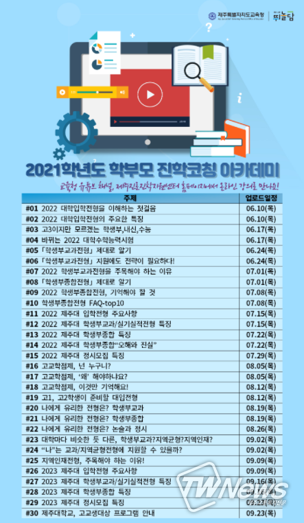 [제주교통복지신문=박희찬 기자] 제주도교육청(교육감 이석문)은 도내 중·고등학생과 학부모를 대상으로 '2021학년도 학부모 진학코칭 아카데미’동영상을 제작하여 도교육청 유튜브 체널에 탑재하고 있다.
