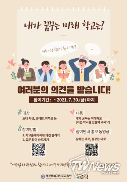 ‘학교와 함께 만드는 제주미래교육 비전’은 도내 유치원·초·중·고등학생, 교직원, 학부모를 대상으로 6월 14일부터 7월 30일까지 제주미래교육 비전 관련 설문 참여하고, 내가 꿈꾸는 미래학교의 모습(학교상, 교사상, 학생상)에 대한 활동 결과를 홈페이지 탑재하는 방식으로 운영된다.