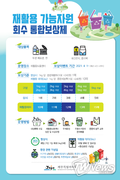 서귀포시 관계자는 “재활용 가능자원 회수 통합보상 이벤트가 재활용 자원 분리배출 활동이 몸에 밸 수 있는 촉매제가 되길 바라며, 매달 개최되는 재활용데이 행사에 시민들의 적극적인 참여를 바란다”고 말했다.