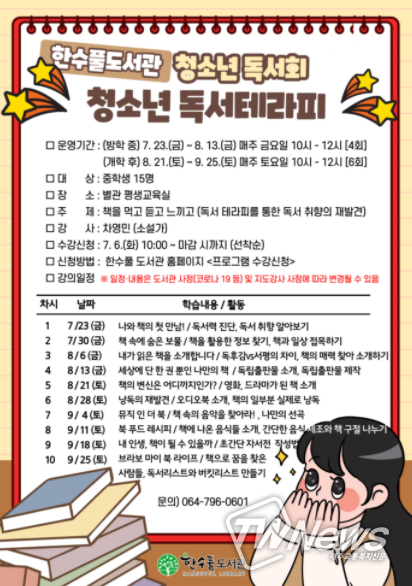 [제주교통복지신문=박희찬 기자] 제주도교육청 한수풀도서관은 지역 청소년들이 다양한 감각을 활용한 독서 테라피 수업을 통해 책 읽는 즐거움을 익힐 수 있도록 청소년 독서회 ‘청소년 독서테라피’를 운영할 예정이다.
