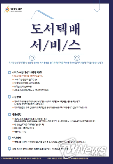 [제주교통복지신문=박희찬 기자] 제주도교육청 제남도서관은 남원읍 관내 주민 중 도서관 이용이 어려운 독서취약 계층에게 도서관 자료를 자택까지 무료로 배송해주는 2021년 독서취약계층 도서택배 서비스를 운영한다.