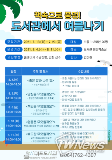 [제주교통복지신문=박희찬 기자] 제주도교육청 서귀포도서관은 여름방학을 맞아 어린이들이 도서관에서 다양한 경험을 쌓으며 독서의 즐거움을 발견하고 도서관 이용의 생활화를 유도하고자‘책속으로 풍덩! 도서관에서 여름나기’를 운영한다.