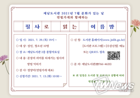 [제주교통복지신문=박희찬 기자] 제주도교육청 제남도서관은 지역주민들에게 일상 속에서 문화를 즐길 수 있는 기회를 제공하고자‘2021년 7월 문화가 있는 날–필사로 읽는 여름밤’을 운영한다.