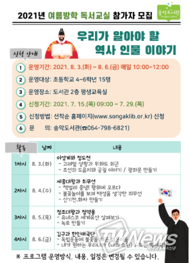 본 강좌는 초등학생 4~6학년 15명을 대상으로 8월 3일부터 8월 6일까지 총 4회에 걸쳐 매일 오전 10시부터 12시까지 운영되며, 7월 15일부터 홈페이지를 통해 선착순으로 신청할 수 있다.