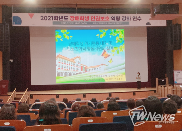 [제주교통복지신문=박희찬 기자] 제주시교육지원청특수교육지원센터는 2021년 7월 9일 제주시 관내 유·초·중등 특수교사, 통합학급 담임교사, 특수교육 업무 담당교사 및 관리자를 대상으로‘장애학생 인권보호를 위한 교원 역량 강화 연수’를 실시했다.