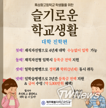 [제주교통복지신문=박희찬 기자] 제주도교육청은 수능 없이 대학 입학이 가능하고 등록금 걱정 없이 학위를 취득할 수 있는 특성화고 대학 입학 지원 정책을 담은 '슬기로운 학교생활-선취업 후학습을 위한 대학진학편' 홍보 포스터를 제작, 배포하고 있다.