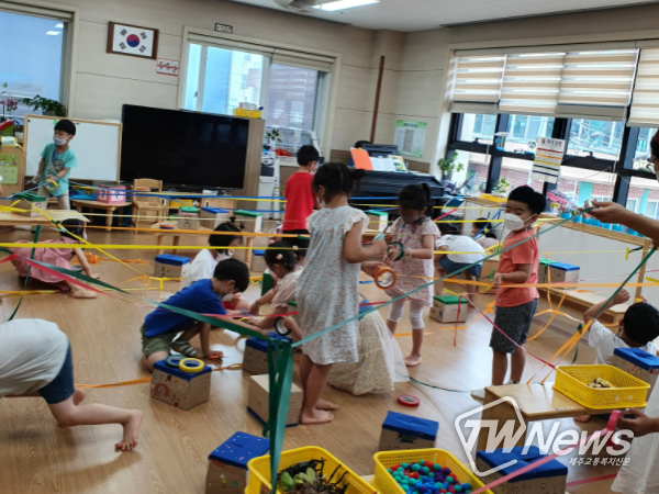 14일은 지혜반의‘휴지심으로 만드는 구슬 터널’및 아름반의 ‘테이프는 놀이 친구’활동을 했고, 16일(금)은 슬기반의‘꾸깃꾸깃 신문지 놀이’및 행복반의‘종이테이프로 즐겁게 놀이해요’를 했다.