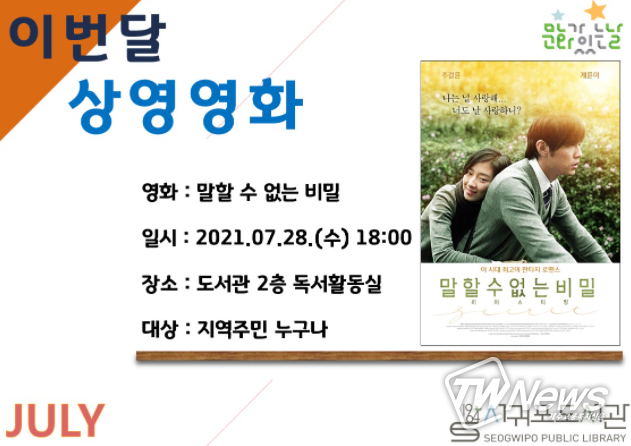 이번 달 상영작은 누구나 함께 즐길 수 있는 대만 판타지 로맨스 영화‘말할 수 없는 비밀’이며, 서귀포도서관 2층 독서활동실에서 저녁 6시부터 별도 신청 없이 관람할 수 있다.