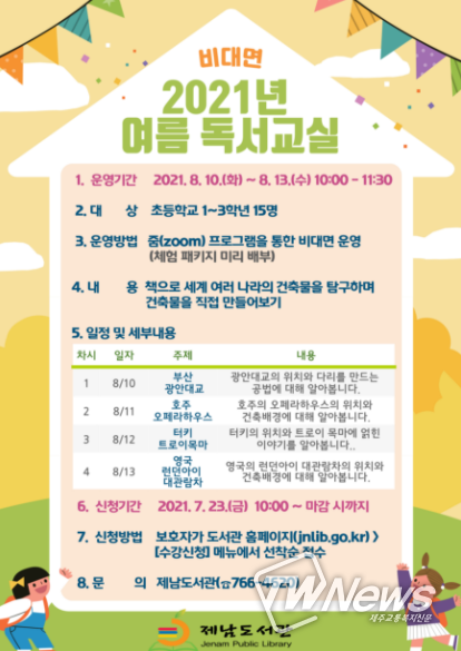 [제주교통복지신문=박희찬 기자] 제주도교육청 제남도서관은 어린이들에게 도서관에서의 다양한 독서 경험을 통해 독서능력 함양 및 도서관 이용의 생활화를 유도하고자 ‘[비대면] 2021년 여름 독서교실 – 건축으로 떠나는 세계여행’을 운영한다.
