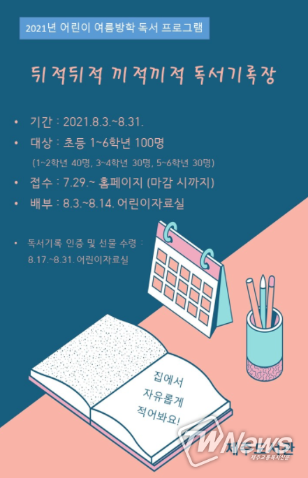 [제주교통복지신문=박희찬 기자] 제주도교육청 제주도서관은 여름방학을 맞이하여 초등 1~6학년 100명을 대상으로 2021년 어린이 여름방학 독서 프로그램‘뒤적뒤적 끼적끼적 독서기록장’을 운영한다.