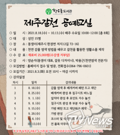 도서관 관계자는“수강생들이 감물 염색을 배우면서 제주 향토문화에 대한 자부심과 애향심을 고취 시킬 수 있는 시간이 되기를 바란다.”라고 전했다.