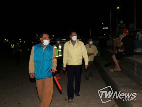 [제주교통복지신문 김현석 기자] 안동우 제주시장은 1일(22:00) 이호 테우 해수욕장을 방문, 야간 방역 수칙 위반 단속 현장을 계도‧점검했다고 밝혔다.