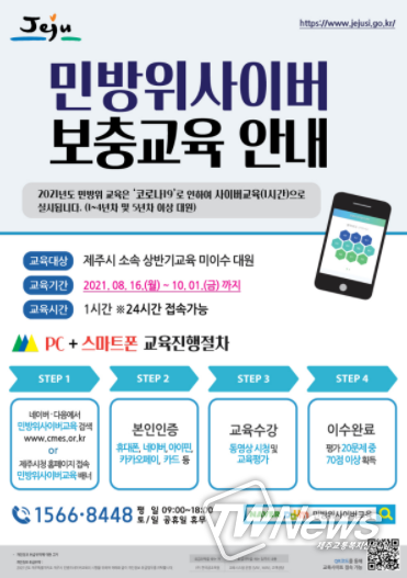 [제주교통복지신문 김현석 기자] 제주시는 오는 8월 16일부터 10월 1일까지 상반기 본 교육 미이수 대원을 대상으로 ‘2021년 민방위 사이버 보충교육’을 실시한다고 밝혔다.