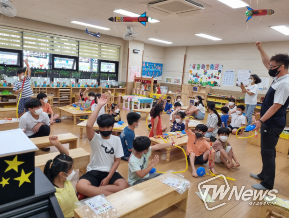 [제주교통복지신문=박희찬 기자] 제주도교육청 외도초병설유치원은 8월 2일부터 8월 5일까지 4일간 여름방학 중 방과후과정에 참여하는 유아들을 대상으로 초등학교 과학동아리 학생들과 함께 유․초연계프로그램으로‘함께하는 에어로켓 놀이’를 실시하고 있다.