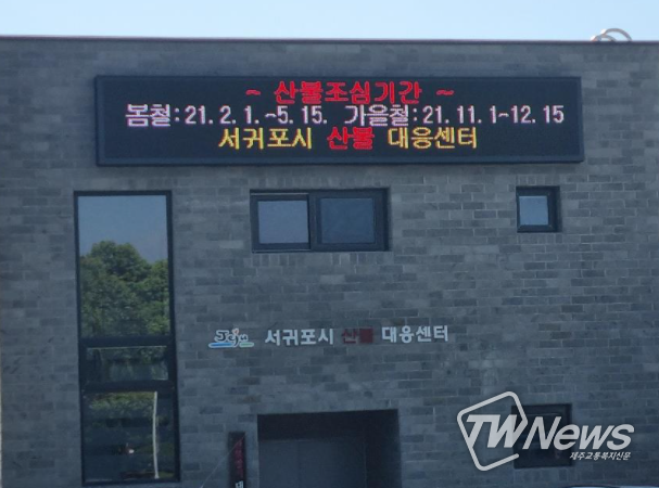 [제주교통복지신문 김현석 기자] 서귀포시는 2021년 가을철 산불 조심기간 전에 시민들에게 산불조심에 대한 경각심을 심어주기 위해 서귀포시청 2청사에 위치한 산불대응센터에 산불예방 홍보 LED 전광판을 설치했다.