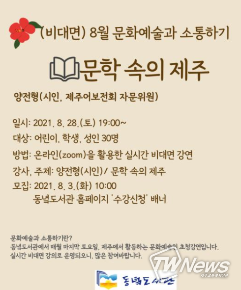 [제주교통복지신문=박희찬 기자] 제주도교육청 동녘도서관은 지역주민과 제주에서 활동하는 문화예술인과의 만남의 자리를 마련하고자‘(비대면) 8월 문화예술과 소통하기: 문학 속의 제주’참가자를 모집한다.