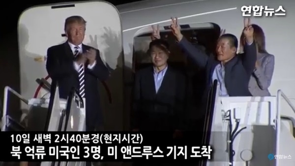 북한에 체포돼 있다가 석방된 한국계 미국인 김동철, 김상덕, 김학송 씨 등 3명이 10일(현지시간) 미국으로 귀환했는데 트럼프 대통령이 “특별한 밤”이라며 김정은 위원장에게 감사의 뜻을 밝힌 것.