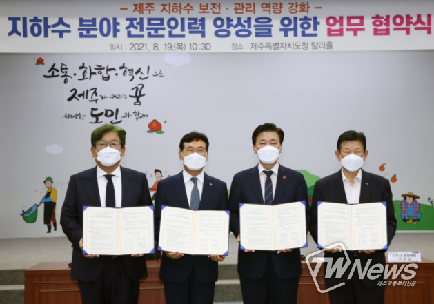제주도는 19일 오전 10시 30분 제주도청 탐라홀서 제주대학교, 제주도개발공사, 제주연구원과 함께 ‘지하수 분야 전문인력 양성을 위한 업무협약’을 체결했다.