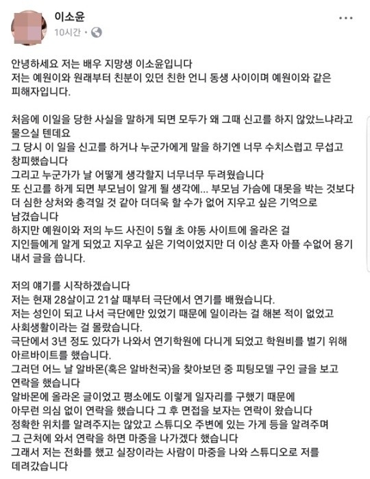 최근 국내 유명 온라인 커뮤니티 게시판에는 ‘이소윤 사건, 실화야?’라는 제목으로 언론들이 보도한 글들이 속속 올라오고 있다. 이는 배우지망생 이소윤 씨가 자신의 SNS에 올린 글들을 종합한 것이다. 관련 내용은 가히 충격적이다. 이소윤 당사자가 이같은 글을 쓸 때 손이 떨렸을 것이라는 누리꾼들의 심경글은 뜨거운 추천을 받고 있다.
