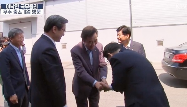 이낙연 국무총리가 17일 서울 모처에서 개최된 '대한민국 중소기업인 대회'에서 유공자를 포상한 뒤 악수하면서 고개를 90도 숙이는 모습이 언론에 포착됐기 때문.