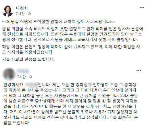 한국당 나경원 의원의 비서가 중학생과의 전화통화를 하면서 사실과 다른 이야기와 함께, 거친 언행을 쏟아낸 것으로 확인돼 충격을 주고 있다.
