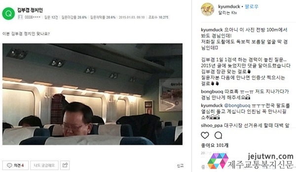 사진 속 김부겸 장관은 업무 차 KTX 열차로 추정되는 객차에서 피곤한지 수면을 취하고 있는데, 누군가 이른바 ‘도촬(도둑 촬영)’을 한 것으로 추정된다.