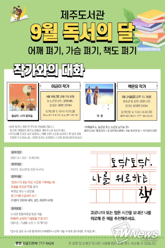 [제주교통복지신문=박희찬 기자] 제주도서관은 9월 독서의 달을 맞이하여 지역주민들이 좋은 책을 읽고 쓰고 함께 이야기 나누며 코로나19로 지친 마음을 위로할 수 있는 시간을 마련하다.