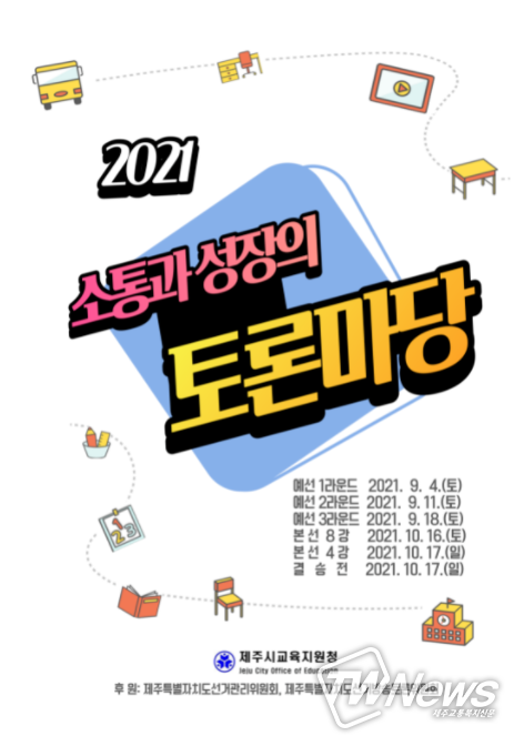 [제주교통복지신문=박희찬 기자] 제주시교육지원청은 오는 9월 4일부터 10월 17일까지 총 5회에 걸쳐 제주시 관내 중학생을 대상으로‘2021 소통과 성장의 제주시 학생 토론마당’을 개최한다. 이번 행사는 코로나19 상황을 고려하여 온라인 가상플랫폼에서 진행되며 25팀(총 100명)이 출전하여 기량을 펼치게 된다.