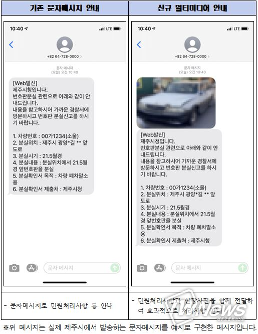 [제주교통복지신문 김현석 기자] 제주시는 민원안내 서비스 질 향상을 위해 그동안 문자만 지원하던 문자서비스에 멀티미디어(사진)를 포함하는 민원안내 문자서비스를 제공한다고 밝혔다.