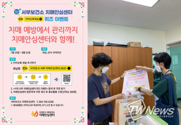 [제주교통복지신문 김현석 기자] 서귀포시 서부보건소는 ‘치매 예방에서 관리까지’라는 슬로건아래 7월과 8월 두달 동안‘선물이 있는 카카오톡 채널 치매인식개선 이벤트’를 운영, 343명의 주민이 참여하여 성황리 마무리했다.