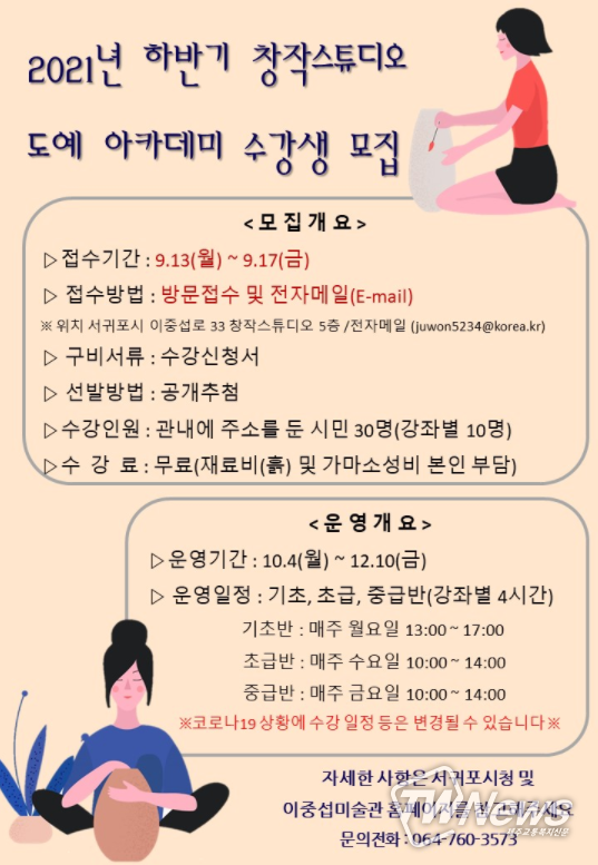 서귀포시 관계자는 “서귀포 시민의 많은 호응을 얻고 있는 도예 아카데미가 코로나19로 답답한 일상을 겪는 시민들에게 조금이나마 마음의 위안이 되기를 기대하며 철저한 방역 수칙 아래 도예 아카데미를 운영할 예정이다.”라고 전했다.