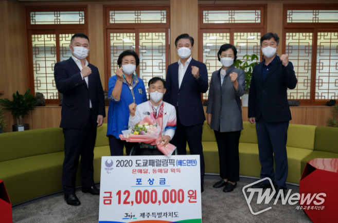 구만섭 제주도지사 권한대행은 14일 오후 1시 30분 소통회의실에서 2020 도쿄 패럴림픽에서 배드민턴 은메달(복식)과 동메달(개인단식) 등 총 2개 메달을 획득한 제주도청 직장운동경기부 소속 이동섭 선수를 만나 격려의 말을 전하고 포상금 1200만원을 지급했다.