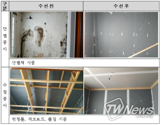 한편 지난 2020년에는 4억 5천 4백만원 예산을 투입해 총 68가구(△대보수18 △중보수15 △경보수35)를 대상으로 수선유지 급여사업을 추진한 바 있으며, 주거 환경이 개선된 대상자들이 크게 만족하고 있다.